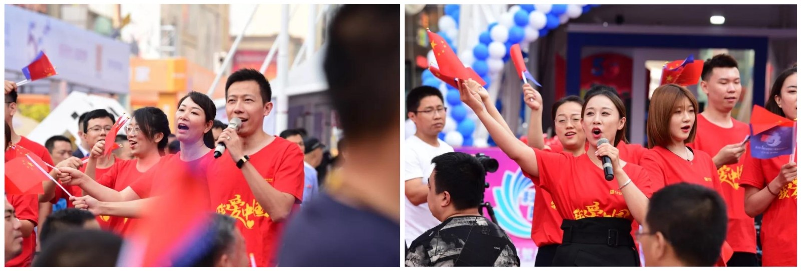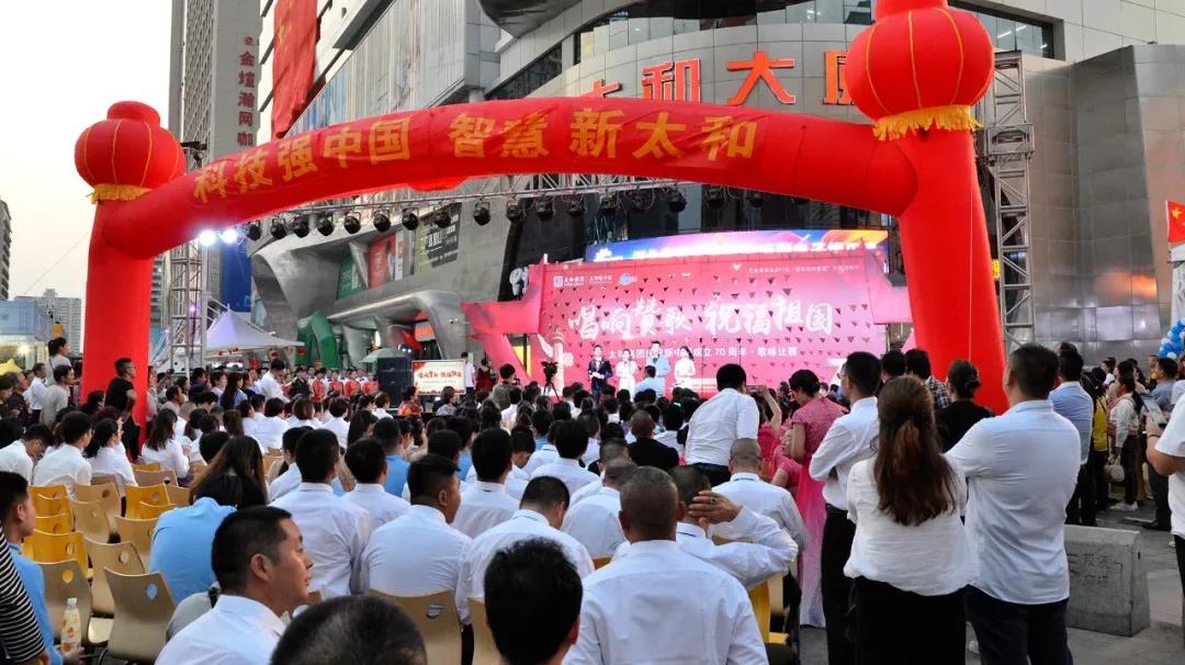 而到了2019年9月30日晚,華燈初上,夜色闌珊,太和集團慶祝新中國成立70周年歌詠比賽在太和大廈門口熱烈舉行。作為本次娛樂周啟動儀式當天的接力節目,歌唱比賽現場更是人潮涌動。