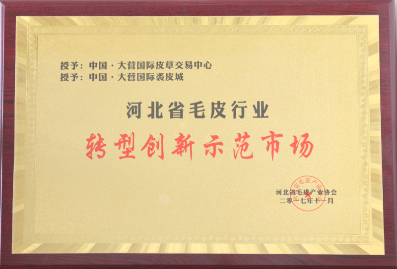 中國·大營國際皮草交易中心 中國·大營國際裘皮城 榮獲 河北省毛皮行業(yè)轉(zhuǎn)型創(chuàng)新示范市場