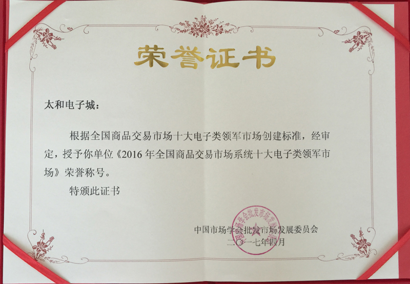 太和電子城榮獲 2016年全國(guó)商品交易市場(chǎng)系統(tǒng)十大電子類領(lǐng)軍市場(chǎng)